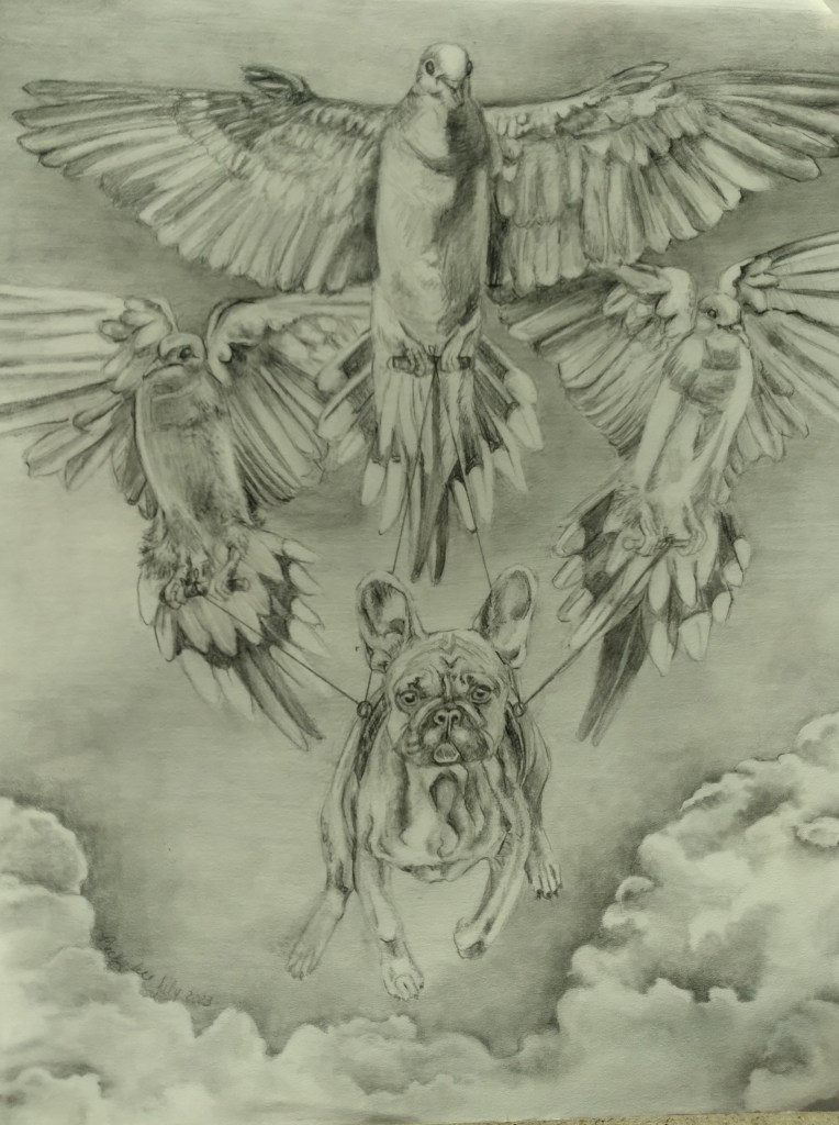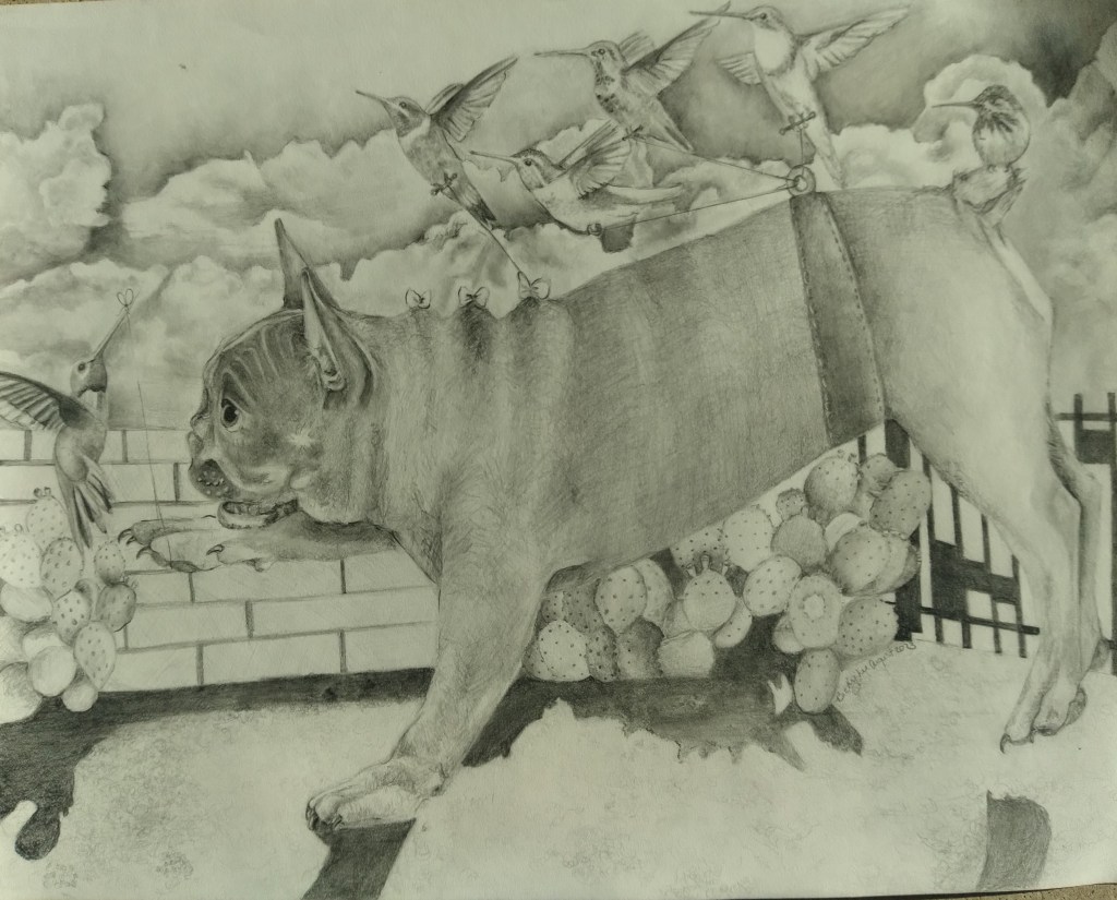 This is a 11 x 14 inch graphite. Another frenchie being lifted by the many Arizona humming birds.